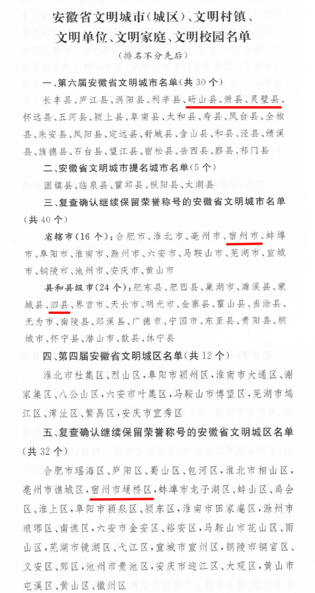 近日,安徽省文明办印发《关于命名表彰安徽省文明城市(城区)、文明村镇、文明单位、文明家庭、文明校园的通报》,宿州市、砀山县、萧县、埇桥区、灵璧县、泗县被命名表彰为安徽省文明城市(城区)。我市全域文明创建实现重大突破,四县一区首次全部获评安徽省文明城市(城区)。